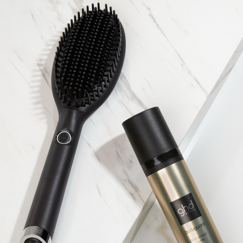 So how do I get a straight and sleek look in just a few minutes? Simple! First, on dry hair use a regular hair brush, such as the ghd® paddle brush to detangle the hair. If your hair is longer or thicker, divide your hair into 2-3 sections. On shorter or thinner hair, sectioning probably isn’t necessary thanks to the longer bristles ability to easily brush through the hair strands. Apply the ghd® straight on - straight & smooth spray across the whole head and comb through with the ghd® detangling comb to protect your hair from heat damage and help your style last. Then, simply glide the brush through from root to tip across a 2-inch section of hair slowly 2-3 times, lightly holding the ends of the hair with your fingers to create mild tension. Repeat this across the whole head, and that’s all there is to it!