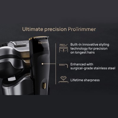 The Series 9 PRO+ electric razor redefines shaving to deliver ultimate closeness & skin comfort. With 5 specialized ProShave elements including the new ProLift Blade, Series 9 PRO+ provides an efficient and gentle shave in every stroke, no matter if its a 1, 3, or 7-day beard. Get ultimate precision thanks to the Precision ProTrimmer enhanced with surgical-grade stainless steel, perfectly cutting even the longest hairs, sideburns and moustache.