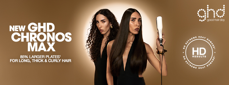 With 85% larger¹ ceramic floating plates, ghd chronos max combines wider plates and 24% thinner edges² with a curved design to get closer to the roots, ensuring perfect root-to-tip results from any angle.