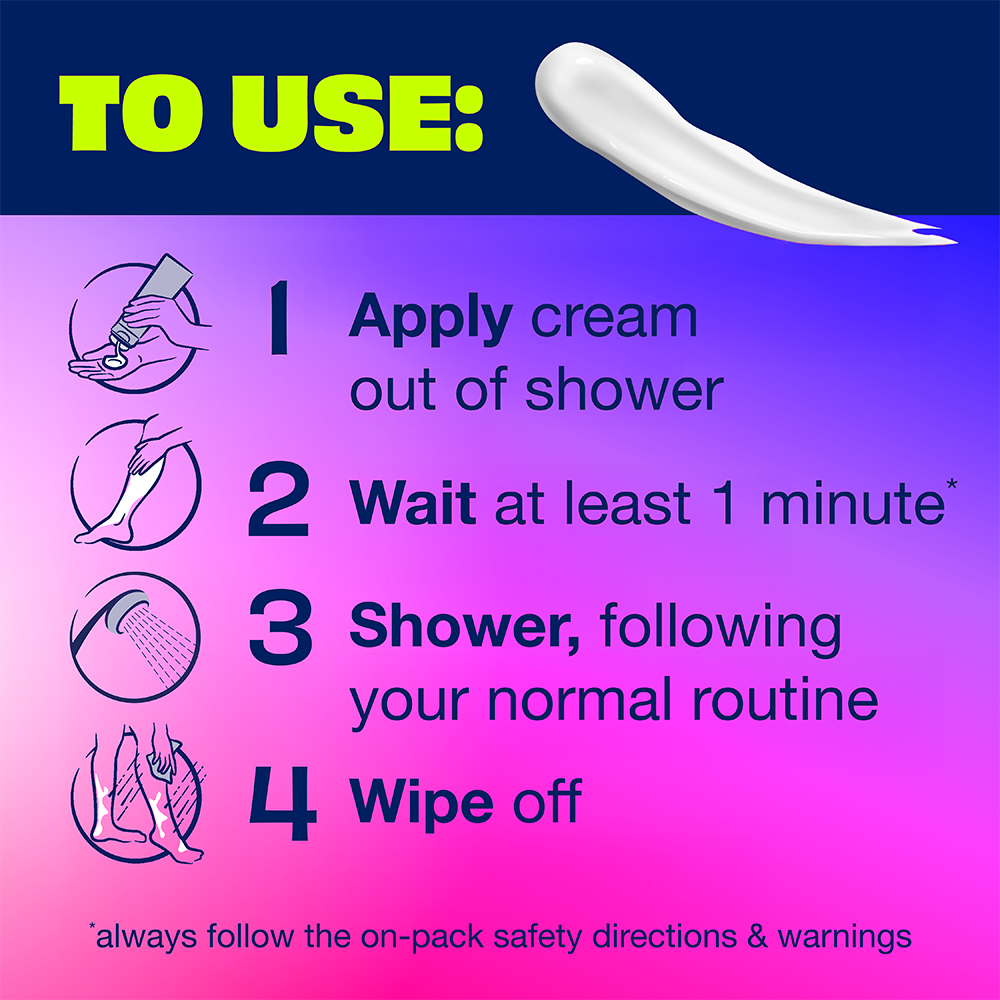 - Shower: follow your usual routine, keeping the cream away from the direct stream of water. Leave on for a further 2 minutes while you shower.