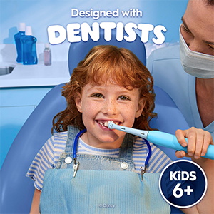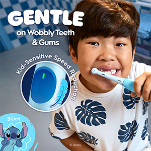 The round brush head cups each tooth individually and reaches the back molars and gum line where flat brushes miss - especially important while kids' teeth are still developing. The automatic gum pressure sensor slows the brush and signals red when they push too hard, protecting tender gums without needing any reminders.