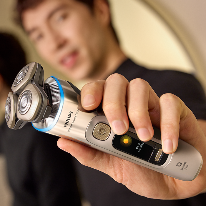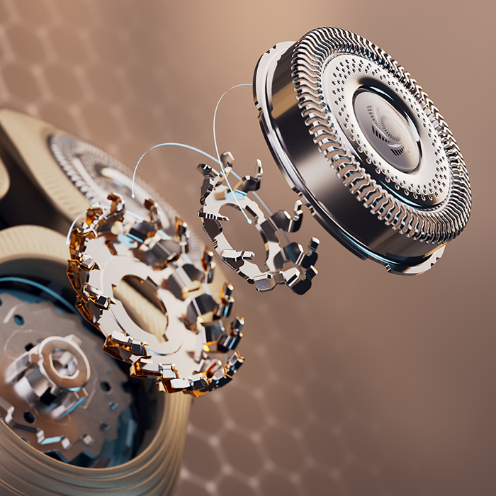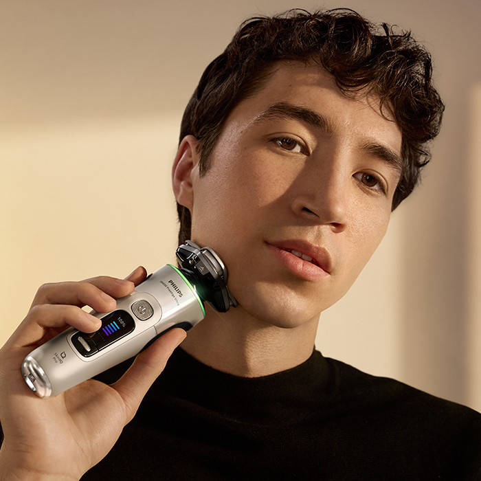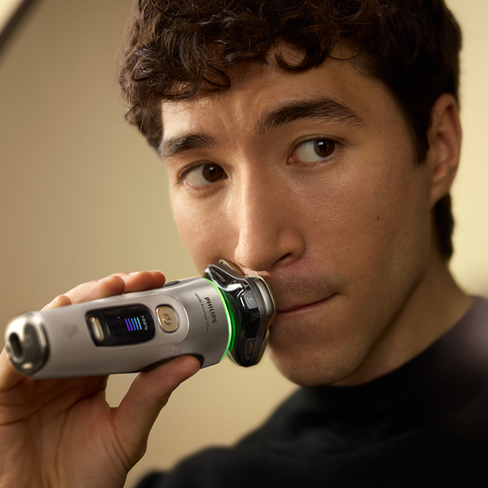 The compact 360° flexing head stays flush against jawlines, chin and neck through every curve. NanoTech Dual Precision blades rotate to catch hair growing in different directions, so you're not reworking the same patch. A built-in sensor reads beard density and adjusts cutting power in real time - dense growth gets more power, lighter areas get less. The shaver moves through thick stubble without dragging or stalling.